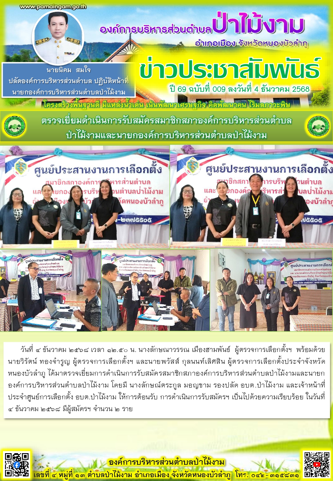 วันที่ 4 ธันวาคม 2568 เวลา 12.50 น. นางลักษณาวรรณ เมืองฮามพันธ์ ผู้ตรวจการเลือกตั้งฯ พร้อมด้วยนายวิรัตน์ ทองจำรูญ ผู้ตรวจการเลือกตั้งฯ และนายพวัสส์ กุลนนท์เลิศสิน ผู้ตรวจการเลือกตั้งประจำจังหวัดหนองบัวลำภู ได้มาตรวจเยี่ยมการดำเนินการรับสมัครสมาชิกสภาองค์การบริหารส่วนตำบลป่าไม้งามและนายกองค์การบริหารส่วนตำบลป่าไม้งาม โดยมี นางลักษณ์ตระกูล มอญขาม รองปลัด อบต.ป่าไม้งาม และเจ้าหน้าที่ประจำศูนย์การเลือกตั้ง อบต.ป่าไม้งาม ให้การต้อนรับ การดำเนินการรับสมัครฯ เป็นไปด้วยความเรียบร้อย ในวันที่ 4 ธันวาคม 2568 มีผู้สมัครฯ จำนวน 2 ราย