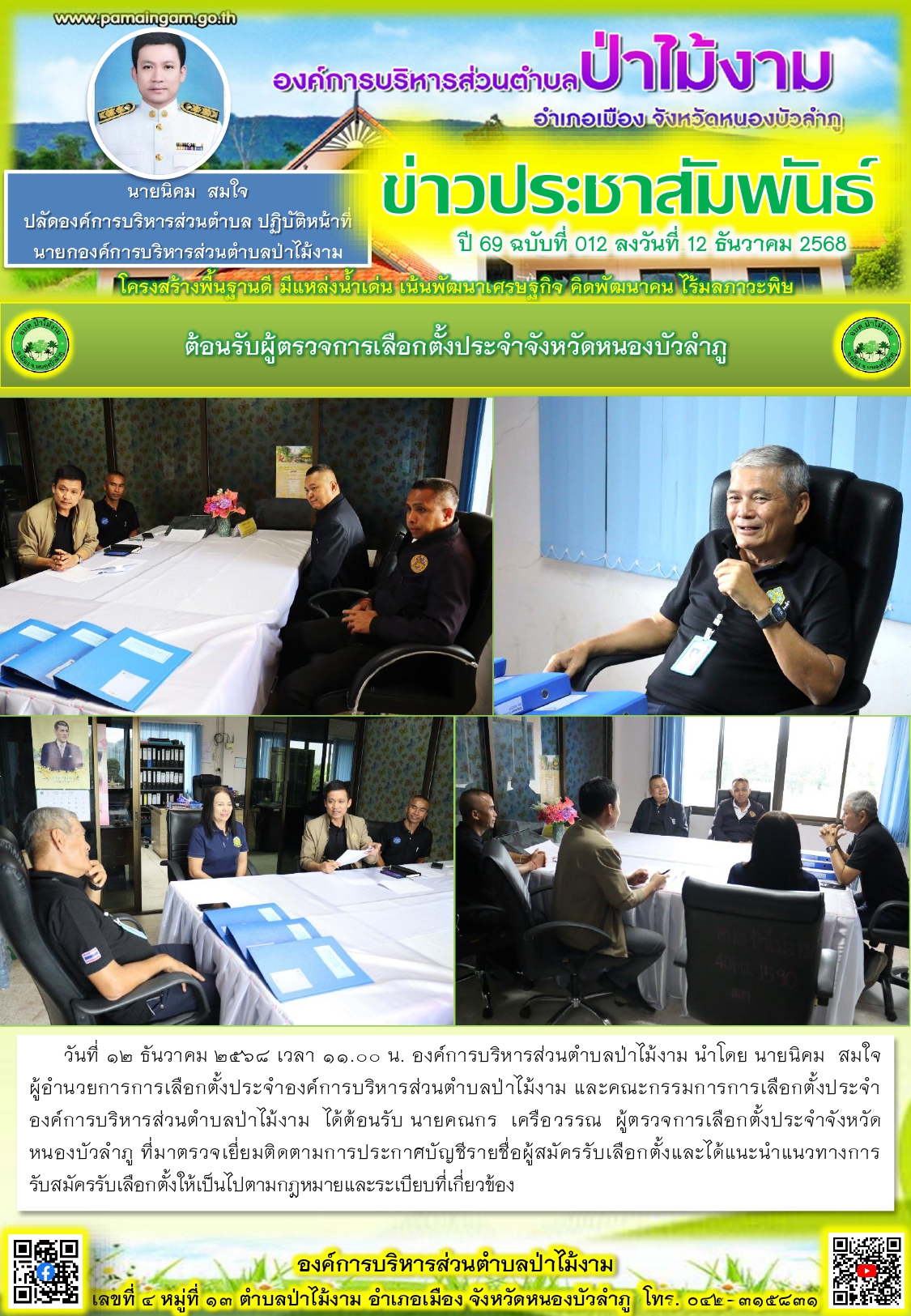 วันที่ 12 ธันวาคม 2568 เวลา 11.00 น. องค์การบริหารส่วนตำบลป่าไม้งาม นำโดย นายนิคม สมใจ ผู้อำนวยการการเลือกตั้งประจำองค์การบริหารส่วนตำบลป่าไม้งาม และคณะกรรมการการเลือกตั้งประจำองค์การบริหารส่วนตำบลป่าไม้งาม ได้ต้อนรับ นายคณกร เครือวรรณ ผู้ตรวจการเลือกตั้งประจำจังหวัดหนองบัวลำภู ที่มาตรวจเยี่ยมติดตามการประกาศบัญชีรายชื่อผู้สมัครรับเลือกตั้งและได้แนะนำแนวทางการรับสมัครรับเลือกตั้งให้เป็นไปตามกฎหมายและระเบียบที่เกี่ยวข้อง