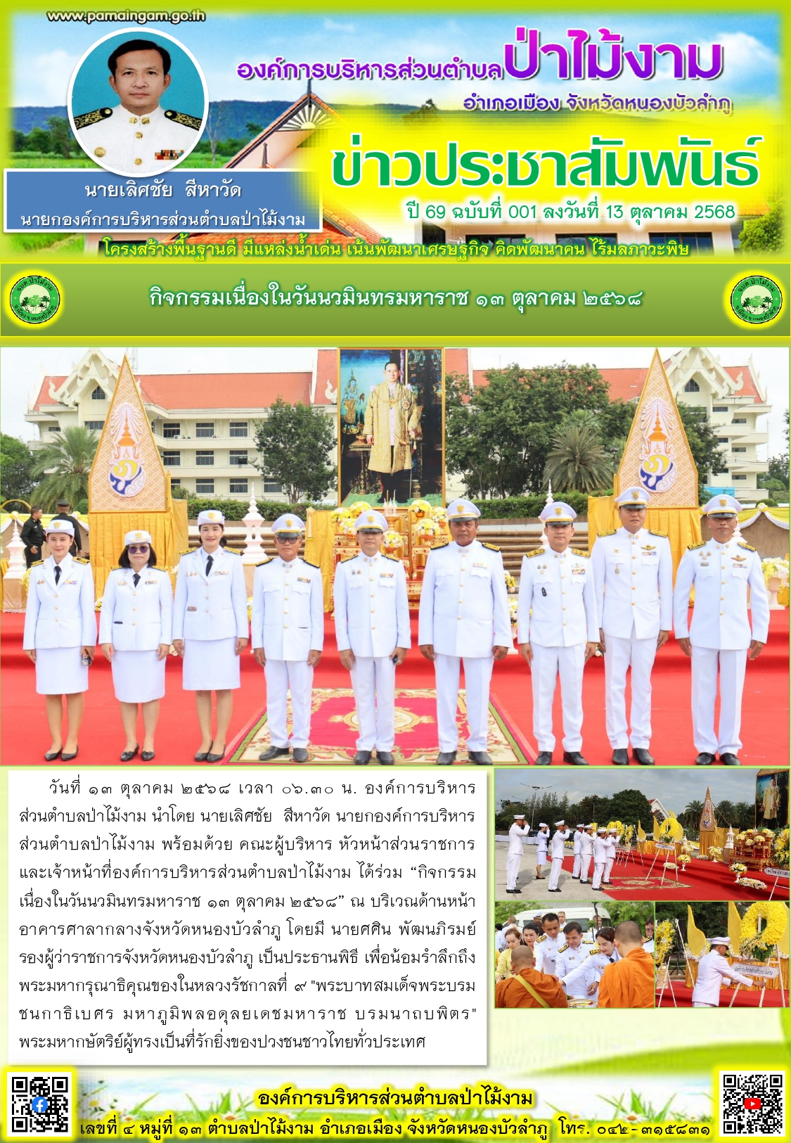 วันที่ 13 ตุลาคม 2568 เวลา 06.30 น. องค์การบริหารส่วนตำบลป่าไม้งาม นำโดย นายเลิศชัย สีหาวัด นายกองค์การบริหารส่วนตำบลป่าไม้งาม พร้อมด้วย คณะผู้บริหาร หัวหน้าส่วนราชการ และเจ้าหน้าที่องค์การบริหารส่วนตำบลป่าไม้งาม ได้ร่วม “กิจกรรมเนื่องในวันนวมินทรมหาราช 13 ตุลาคม 2568” ณ บริเวณด้านหน้าอาคารศาลากลางจังหวัดหนองบัวลำภู โดยมี นายศศิน พัฒนภิรมย์ รองผู้ว่าราชการจังหวัดหนองบัวลำภู เป็นประธานพิธี เพื่อน้อมรำลึกถึงพระมหากรุณาธิคุณของในหลวงรัชกาลที่ 9 "พระบาทสมเด็จพระบรมชนกาธิเบศร มหาภูมิพลอดุลยเดชมหาราช บรมนาถบพิตร" พระมหากษัตริย์ผู้ทรงเป็นที่รักยิ่งของปวงชนชาวไทยทั่วประเทศ