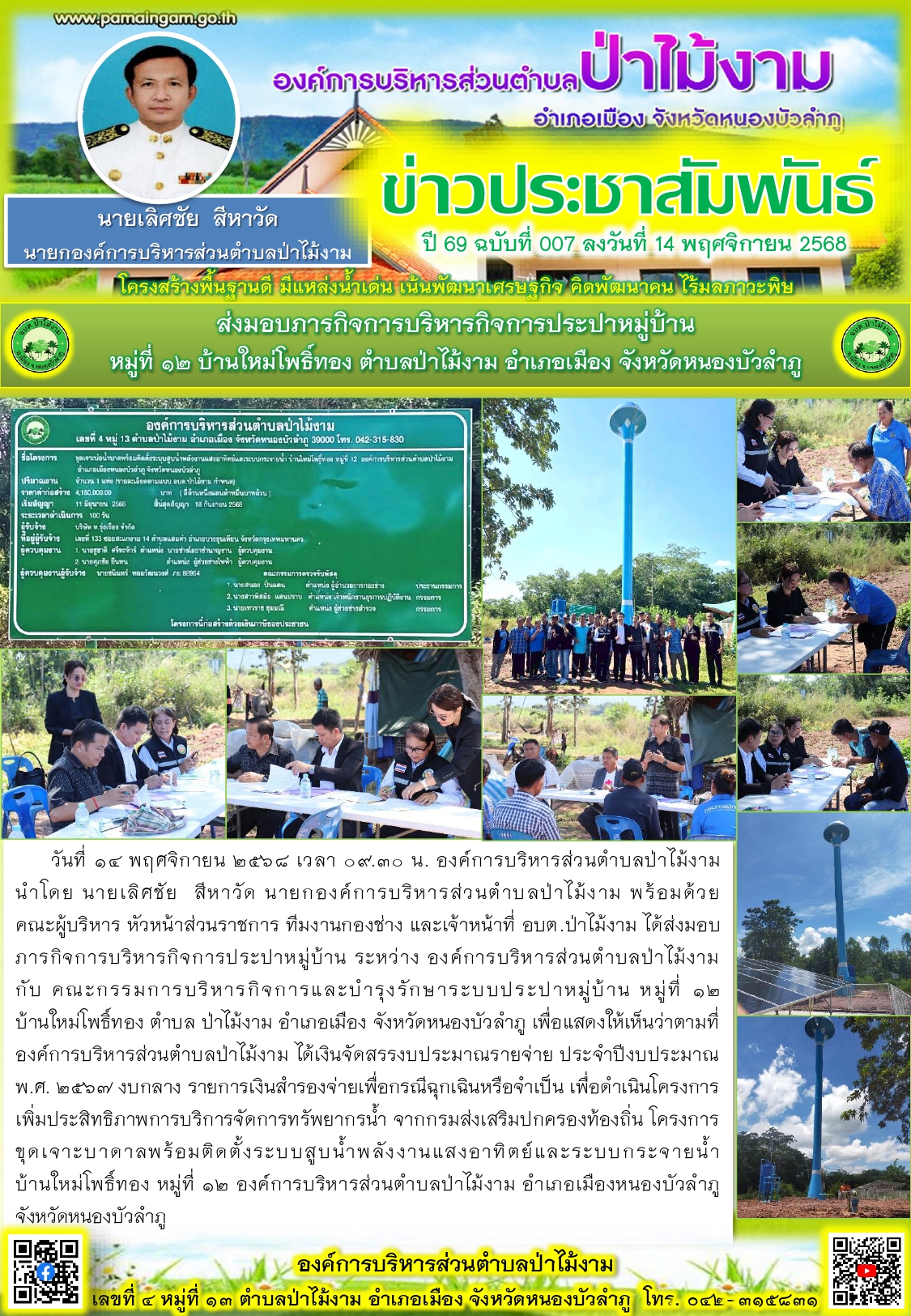 วันที่ 14 พฤศจิกายน 2568 เวลา 09.30 น. องค์การบริหารส่วนตำบลป่าไม้งาม นำโดย นายเลิศชัย สีหาวัด นายกองค์การบริหารส่วนตำบลป่าไม้งาม พร้อมด้วย คณะผู้บริหาร หัวหน้าส่วนราชการ ทีมงานกองช่าง และเจ้าหน้าที่ อบต.ป่าไม้งาม ได้ส่งมอบภารกิจการบริหารกิจการประปาหมู่บ้าน ระหว่าง องค์การบริหารส่วนตำบลป่าไม้งาม กับ คณะกรรมการบริหารกิจการและบำรุงรักษาระบบประปาหมู่บ้าน หมู่ที่ 12 บ้านใหม่โพธิ์ทอง ตำบล ป่าไม้งาม อำเภอเมือง จังหวัดหนองบัวลำภู เพื่อแสดงให้เห็นว่าตามที่องค์การบริหารส่วนตำบลป่าไม้งาม ได้เงินจัดสรรงบประมาณรายจ่าย ประจำปีงบประมาณ พ.ศ. 2567 งบกลาง รายการเงินสำรองจ่ายเพื่อกรณีฉุกเฉินหรือจำเป็น เพื่อดำเนินโครงการเพิ่มประสิทธิภาพการบริการจัดการทรัพยากรน้ำ จากกรมส่งเสริมปกครองท้องถิ่น โครงการขุดเจาะบาดาลพร้อมติดตั้งระบบสูบน้ำพลังงานแสงอาทิตย์และระบบกระจายน้ำ บ้านใหม่โพธิ์ทอง หมู่ที่ 12 องค์การบริหารส่วนตำบลป่าไม้งาม อำเภอเมืองหนองบัวลำภู จังหวัดหนองบัวลำภู