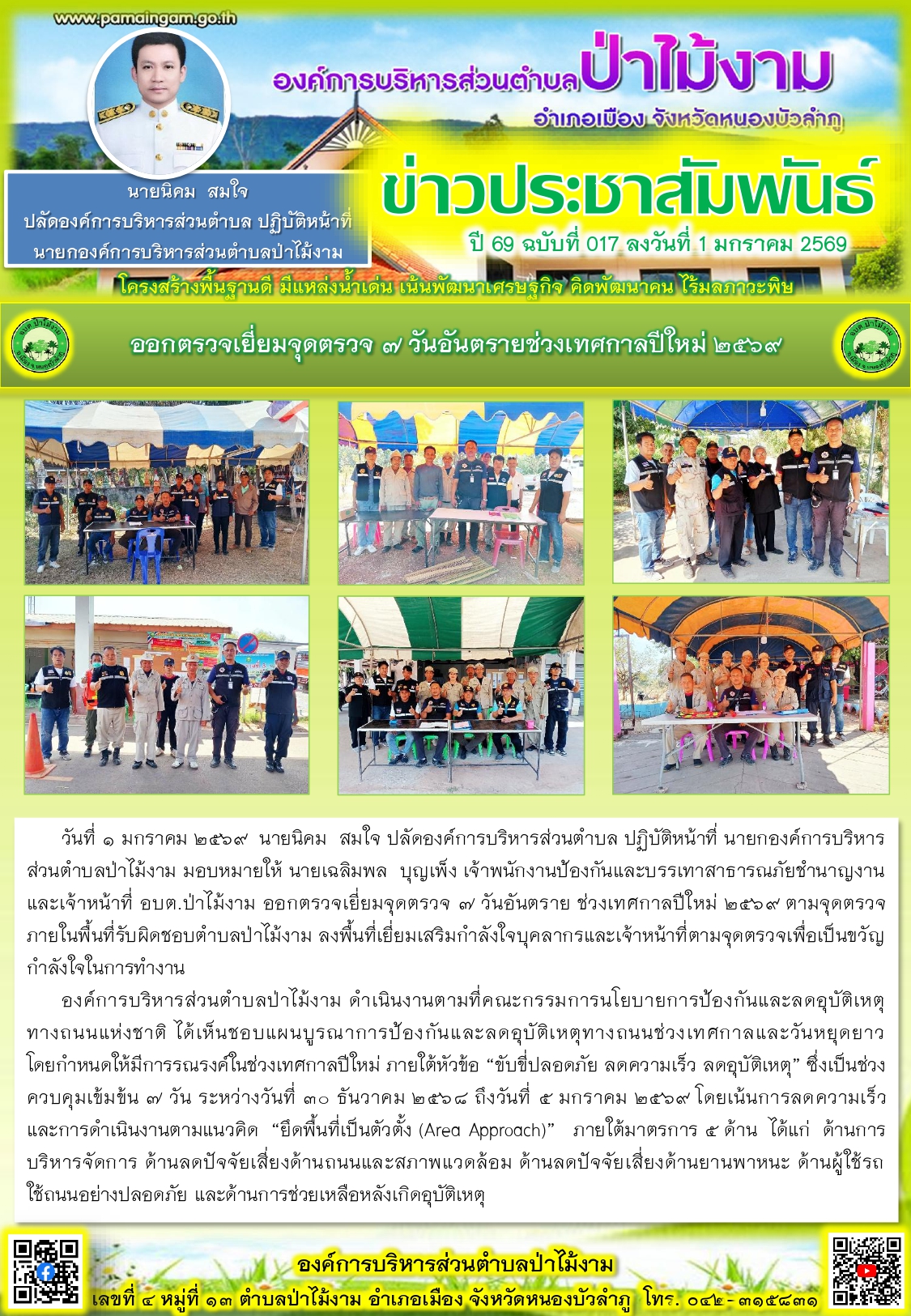 วันที่ 1 มกราคม 2569 นายนิคม สมใจ ปลัดองค์การบริหารส่วนตำบล ปฏิบัติหน้าที่ นายกองค์การบริหารส่วนตำบลป่าไม้งาม มอบหมายให้ นายเฉลิมพล บุญเพ็ง เจ้าพนักงานป้องกันและบรรเทาสาธารณภัยชำนาญงาน และเจ้าหน้าที่ อบต.ป่าไม้งาม ออกตรวจเยี่ยมจุดตรวจ 7 วันอันตราย ช่วงเทศกาลปีใหม่ 2569 ตามจุดตรวจภายในพื้นที่รับผิดชอบตำบลป่าไม้งาม ลงพื้นที่เยี่ยมเสริมกำลังใจบุคลากรและเจ้าหน้าที่ตามจุดตรวจเพื่อเป็นขวัญกำลังใจในการทำงาน