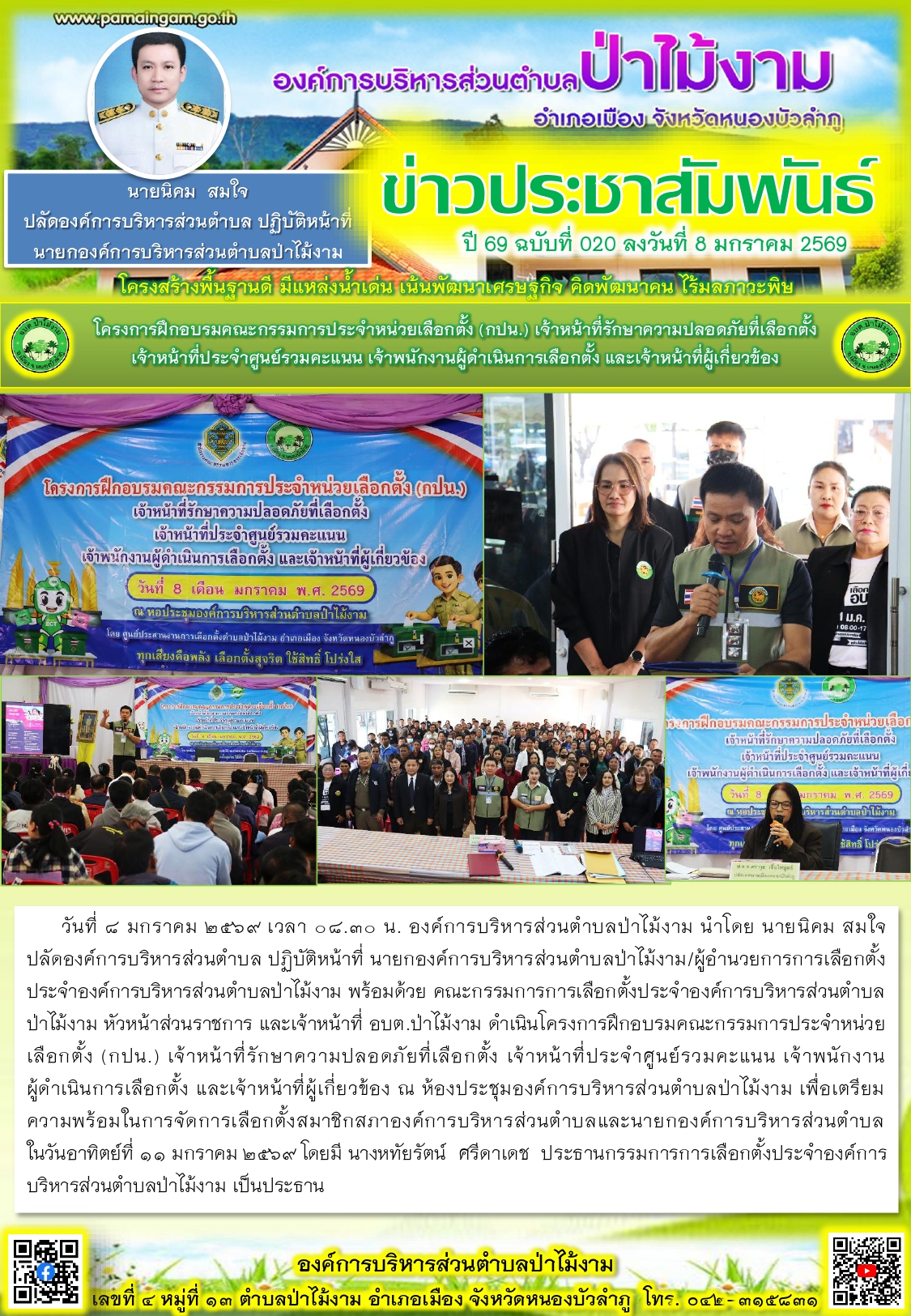 วันที่ 8 มกราคม 2569 เวลา 08.30 น. องค์การบริหารส่วนตำบลป่าไม้งาม นำโดย นายนิคม สมใจ ปลัดองค์การบริหารส่วนตำบล ปฏิบัติหน้าที่ นายกองค์การบริหารส่วนตำบลป่าไม้งาม/ผู้อำนวยการการเลือกตั้งประจำองค์การบริหารส่วนตำบลป่าไม้งาม พร้อมด้วย คณะกรรมการการเลือกตั้งประจำองค์การบริหารส่วนตำบลป่าไม้งาม หัวหน้าส่วนราชการ และเจ้าหน้าที่ อบต.ป่าไม้งาม ดำเนินโครงการฝึกอบรมคณะกรรมการประจำหน่วยเลือกตั้ง (กปน.) เจ้าหน้าที่รักษาความปลอดภัยที่เลือกตั้ง เจ้าหน้าที่ประจำศูนย์รวมคะแนน เจ้าพนักงานผู้ดำเนินการเลือกตั้ง และเจ้าหน้าที่ผู้เกี่ยวข้อง ณ ห้องประชุมองค์การบริหารส่วนตำบลป่าไม้งาม เพื่อเตรียม ความพร้อมในการจัดการเลือกตั้งสมาชิกสภาองค์การบริหารส่วนตำบลและนายกองค์การบริหารส่วนตำบล ในวันอาทิตย์ที่ 11 มกราคม 2569 โดยมี นางหทัยรัตน์ ศรีดาเดช ประธานกรรมการการเลือกตั้งประจำองค์การบริหารส่วนตำบลป่าไม้งาม เป็นประธาน