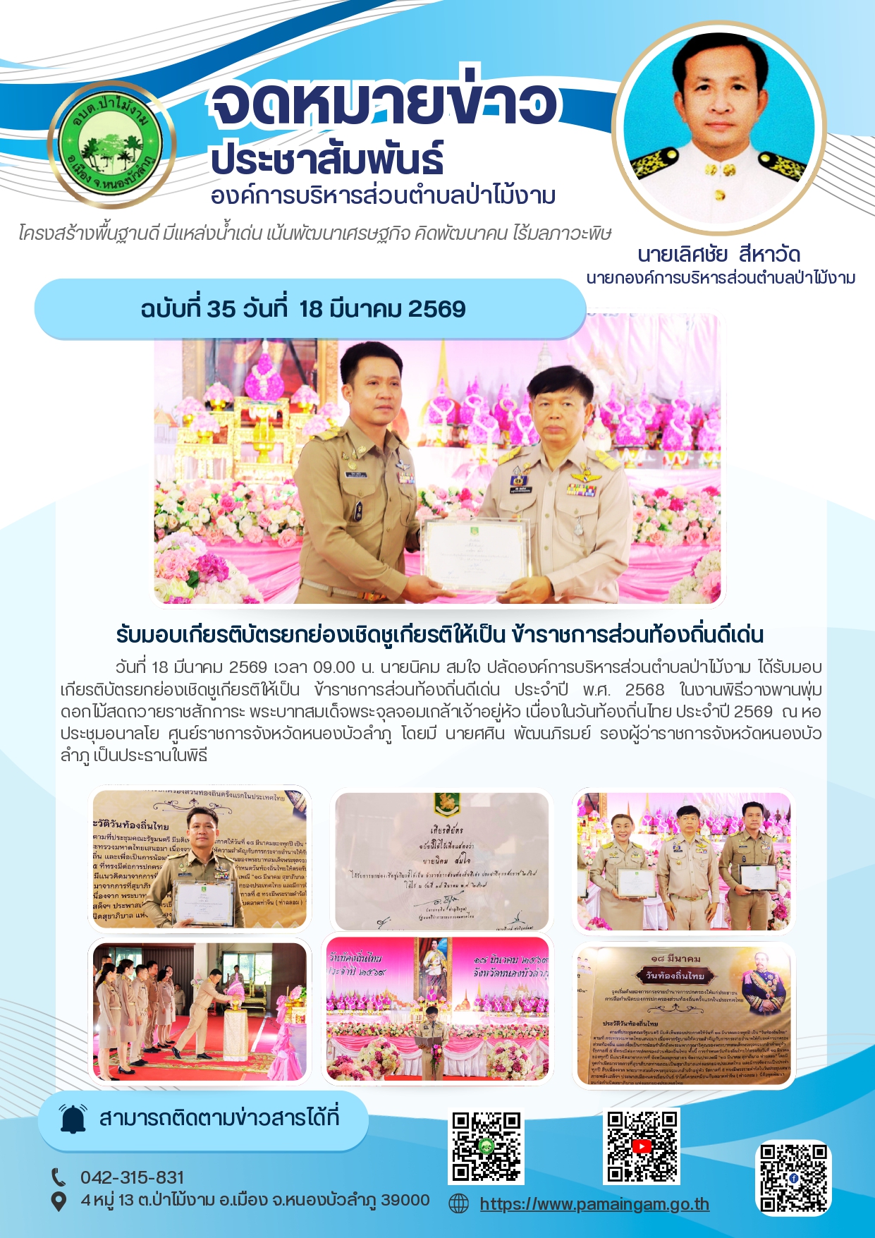 วันที่ 18 มีนาคม 2569 เวลา 09.00 น. นายนิคม สมใจ ปลัดองค์การบริหารส่วนตำบลป่าไม้งาม ได้รับมอบเกียรติบัตรยกย่องเชิดชูเกียรติให้เป็น ข้าราชการส่วนท้องถิ่นดีเด่น ประจำปี พ.ศ. 2568 ในงานพิธีวางพานพุ่มดอกไม้สดถวายราชสักการะ พระบาทสมเด็จพระจุลจอมเกล้าเจ้าอยู่หัว เนื่องในวันท้องถิ่นไทย ประจำปี 2569 ณ หอประชุมอนาลโย ศูนย์ราชการจังหวัดหนองบัวลำภู โดยมี นายศศิน พัฒนภิรมย์ รองผู้ว่าราชการจังหวัดหนองบัวลำภู เป็นประธานในพิธี