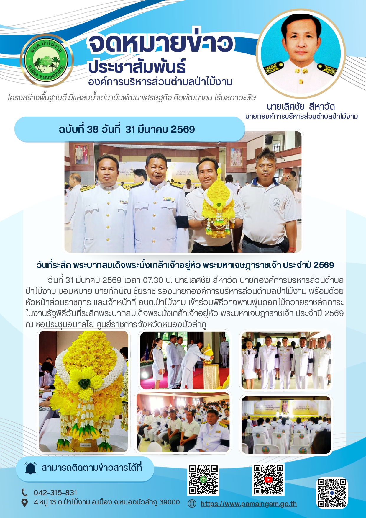 วันที่ 31 มีนาคม 2569 เวลา 07.30 น. นายเลิศชัย สีหาวัด นายกองค์การบริหารส่วนตำบลป่าไม้งาม มอบหมาย นายทักษิณ ชัยราช รองนายกองค์การบริหารส่วนตำบลป่าไม้งาม พร้อมด้วย หัวหน้าส่วนราชการ และเจ้าหน้าที่ อบต.ป่าไม้งาม เข้าร่วมพิธีวางพานพุ่มดอกไม้ถวายราชสักการะในงานรัฐพิธีวันที่ระลึก พระบาทสมเด็จพระนั่งเกล้าเจ้าอยู่หัว พระมหาเจษฎาราชเจ้า ประจำปี 2569 ณ หอประชุมอนาลโย ศูนย์ราชการจังหวัดหนองบัวลำภู