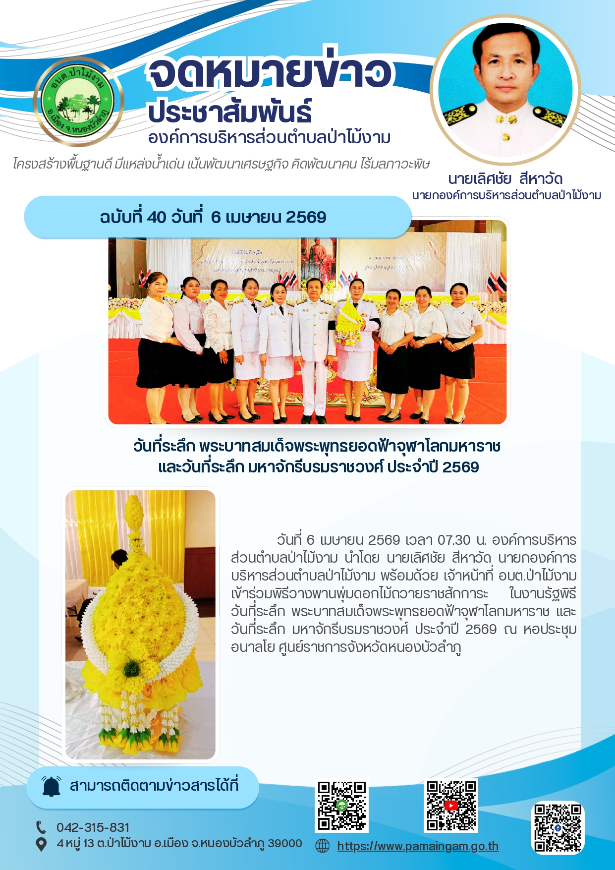 วันที่ 6 เมษายน 2569 เวลา 07.30 น. องค์การบริหารส่วนตำบลป่าไม้งาม นำโดย นายเลิศชัย สีหาวัด นายกองค์การบริหารส่วนตำบลป่าไม้งาม พร้อมด้วย เจ้าหน้าที่ อบต.ป่าไม้งาม เข้าร่วมพิธีวางพานพุ่มดอกไม้ถวายราชสักการะ ในงานรัฐพิธีวันที่ระลึก พระบาทสมเด็จพระพุทธยอดฟ้าจุฬาโลกมหาราช และวันที่ระลึก มหาจักรีบรมราชวงศ์ ประจำปี 2569 ณ หอประชุมอนาลโย ศูนย์ราชการจังหวัดหนองบัวลำภู