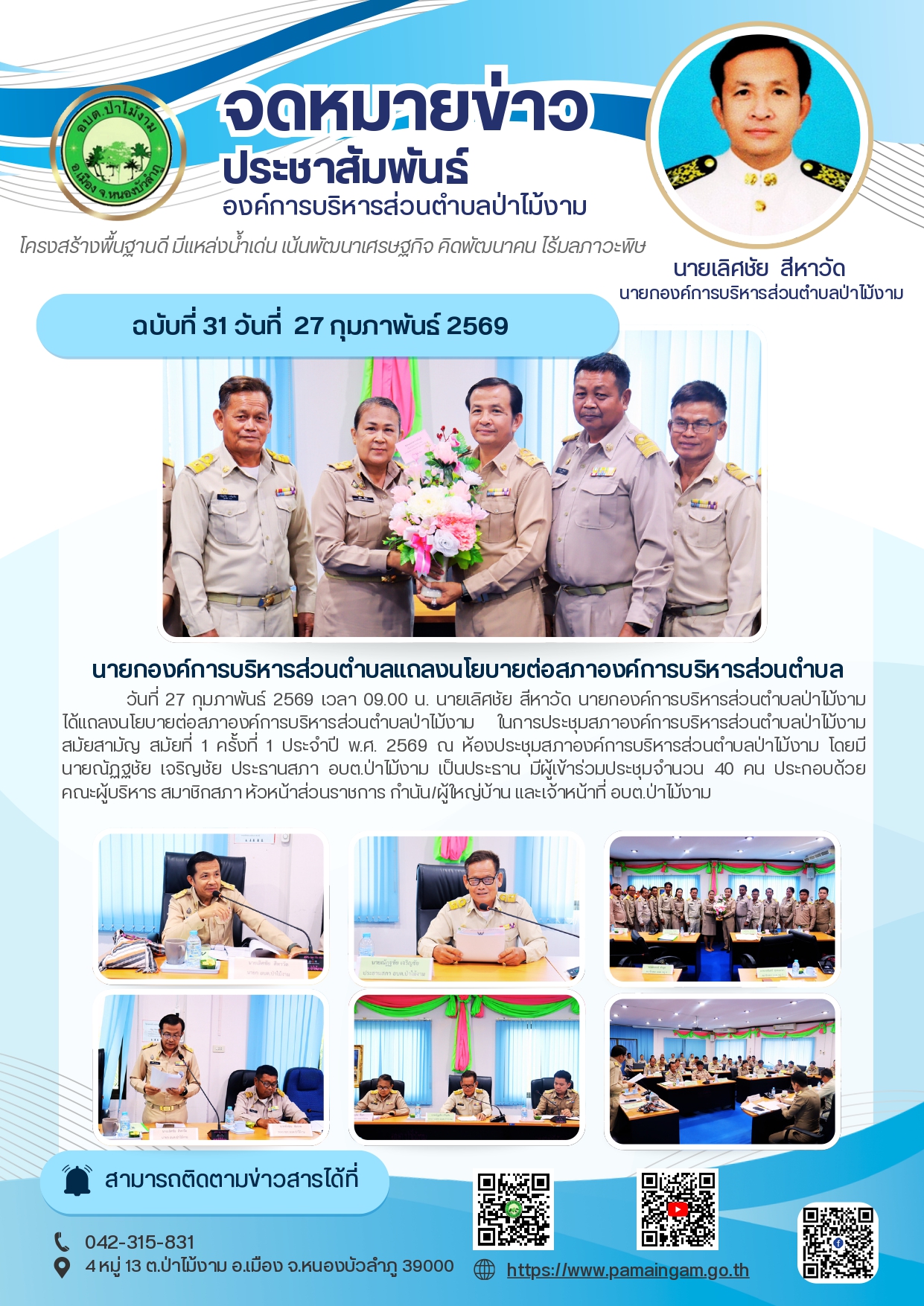 วันที่ 27 กุมภาพันธ์ 2569 เวลา 09.00 น. นายเลิศชัย สีหาวัด นายกองค์การบริหารส่วนตำบลป่าไม้งาม ได้แถลงนโยบายต่อสภาองค์การบริหารส่วนตำบลป่าไม้งาม ในการประชุมสภาองค์การบริหารส่วนตำบลป่าไม้งาม สมัยสามัญ สมัยที่ 1 ครั้งที่ 1 ประจำปี พ.ศ. 2569 ณ ห้องประชุมสภาองค์การบริหารส่วนตำบลป่าไม้งาม โดยมี นายณัฏฐชัย เจริญชัย ประธานสภา อบต.ป่าไม้งาม เป็นประธาน มีผู้เข้าร่วมประชุมจำนวน 40 คน ประกอบด้วย คณะผู้บริหาร สมาชิกสภา หัวหน้าส่วนราชการ กำนัน/ผู้ใหญ่บ้าน และเจ้าหน้าที่ อบต.ป่าไม้งาม