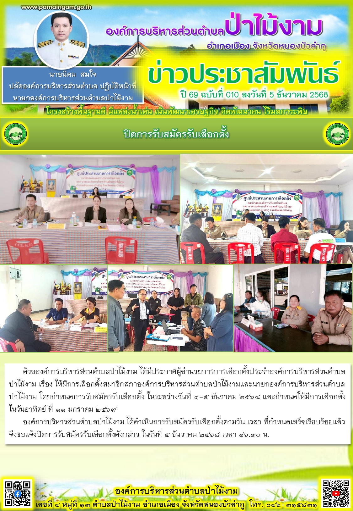 องค์การบริหารส่วนตำบลป่าไม้งาม ได้ดำเนินการรับสมัครรับเลือกตั้งตามวัน เวลา ที่กำหนดเสร็จเรียบร้อยแล้ว จึงขอแจ้งปิดการรับสมัครรับเลือกตั้งดังกล่าว ในวันที่ 5 ธันวาคม 2568 เวลา 16.30 น.
